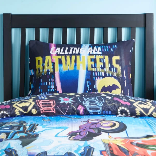 The Batwheels Duvet Cover and Pillowcase Set is perfect for little speedsters. Featuring the Batwheels – Ready to Roll! design, this easy-care poly-cotton set is practical and stylish. The reversible pattern offers two looks in one, and the button closure ensures the duvet stays securely in place. Available in cot bed and single sizes for the perfect fit.
