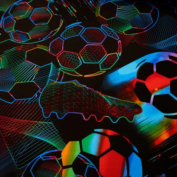 A must-have for any young sports enthusiast’s bedroom. This vibrant bedding ensemble not only showcases an exciting football themed design but also offers versatility with its reversible feature, allowing you to switch up the look whenever you please. Crafted for convenience, the set includes matching standard pillowcase(s) for a coordinated and cohesive appearance. The duvet set is not only stylish but also easy to maintain, as it is machine washable for quick and hassle-free cleaning. The secure button closure ensures a snug fit, providing comfort and ease. For a complete football-inspired bedroom transformation, consider pairing this bedding set with our coordinating eyelet curtains, available to purchase separately.