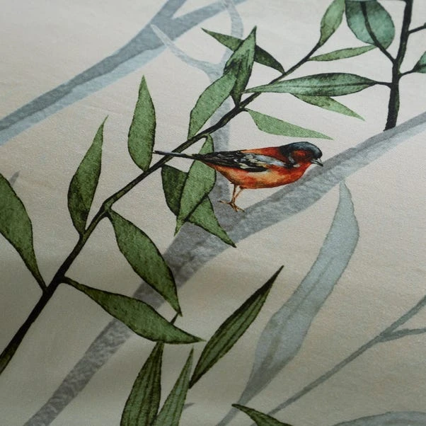 Experience the British woodlands with this duvet cover and pillowcase set. Featuring a serene digital print of lush foliage, forest florals, and native birds on luxuriously soft 300 thread-count 100% cotton sateen, it brings nature indoors. Finished with a contrasting piped edge, this set is perfect for creating a tranquil retreat in your bedroom!