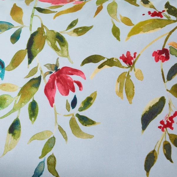 Hand painted modern blooms in saturated colour, pop against the soft teal background on this soft cotton duvet cover and pillowcase set. Rich and luxurious with contrast pink piping adding extra luxe detail, providing you with ultimate style and comfort in your bedroom. Co-ordinating curtains, bedspreads, pillowshams and cushion available.