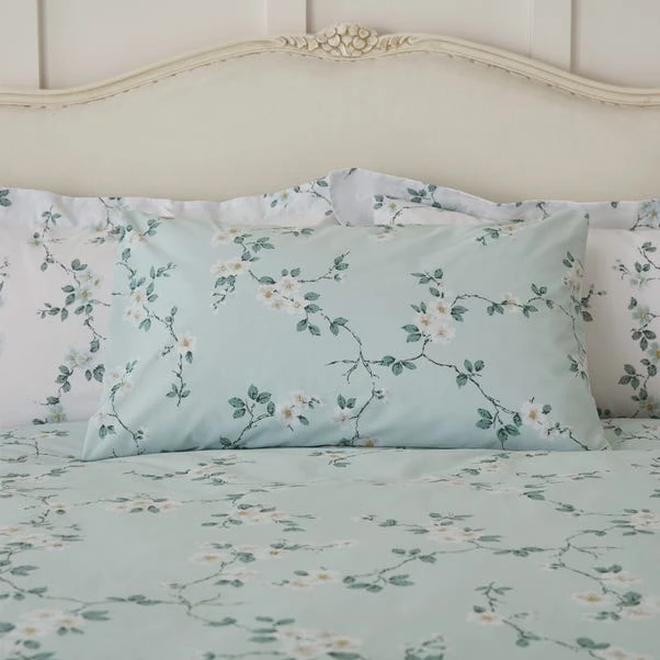 Decorated with delicate springs of blossom on a pretty duck egg background, our Edith duvet cover and pillowcase set is fully reversible for easy colour change featuring a fresh white reverse. Made from a quality polycotton blend with a soft touch design for added comfort, this duvet cover set is machine washable for easy care with coordinating items available to purchase separately.